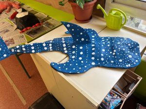 Hem fet 4 figures gegants de paper matxé que representen 4 animals aqüàtics.