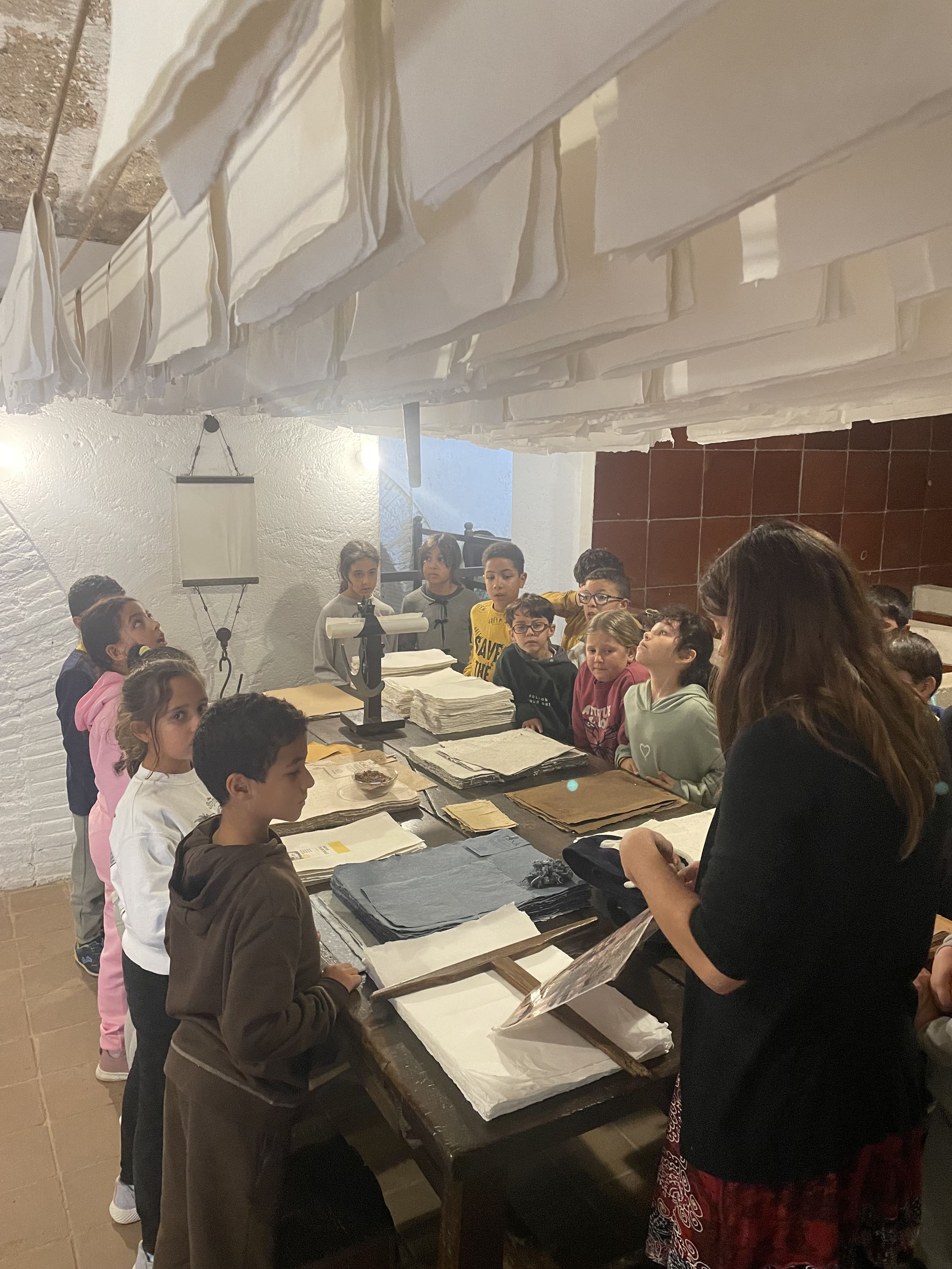El primer indret que vam visitar va ser el Molí Paperer. Els dos grups vam poder realitzar una visita guiada al museu, on ens van ensenyar tot el procés que se seguia antigament per a fabricar el paper de manera artesanal. A més, vam poder veure com funcionaven els molins i vam tenir la gran sort de veure l’artesà del museu fent paper.