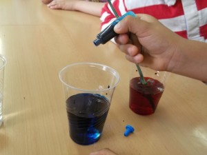 Primer hem omplert tres gots d’aigua i a cada got hem posat tinta d’un color diferent.