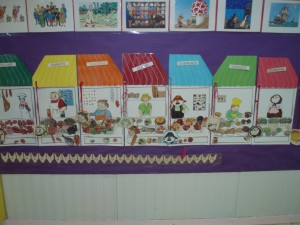 El primer que fem quan arribem a l’escola és treure’ns la jaqueta, deixar la bosseta dins el cistell i anem a seure a la catifa. Un cop estem tots/es ben asseguts ens diem bon dia. Hi ha un nen o nena que fa de patufet/a i un altre/a que fa de botiguer/a (cada setmana ens toca a un de diferent).Entre tots dos ens diuen bon dia i ens pregunten si ens quedem a dinar. Un cop ja sabem els nens i nenes que han vingut a l’escola, els que s’han quedat a casa i els que es queden a menjador, ja podem mirar el dia de la setmana que estem. Depenent del dia en patufet haurà d’anar a la carnisseria d’en Pere, a la fleca de la Núria, a la peixeteria de la Rossita… (el nen/a que li toca fer de botiguer/a cada dia es posa la madalla del personatge que li toca ser). Finalment en Patufet/a col·loca l’aliment que ha comprat en el dia de la setmana del calendari.