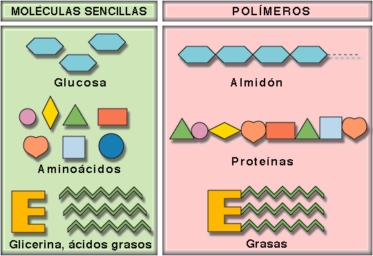 En les cèl·lules únicament poden entrar molècules senzilles (monòmers). Però aquestes són molt escasses en la naturalesa. Normalment el que existeix són grans molècules (polímers), formades per centenars o milers de molècules senzilles unides entre si. Els nutrients que formen part dels aliments són polímers (carbohidrats, lípids i proteïnes)