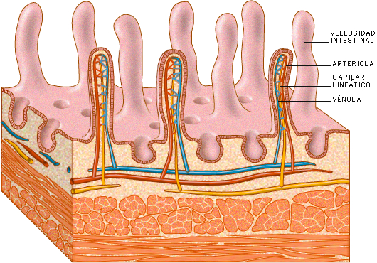 Perquè aquest procés ocorri de manera eficaç les parets internes de l’intestí presenten uns plecs anomenats vellositats intestinals que augmenten la superfície d’absorció.