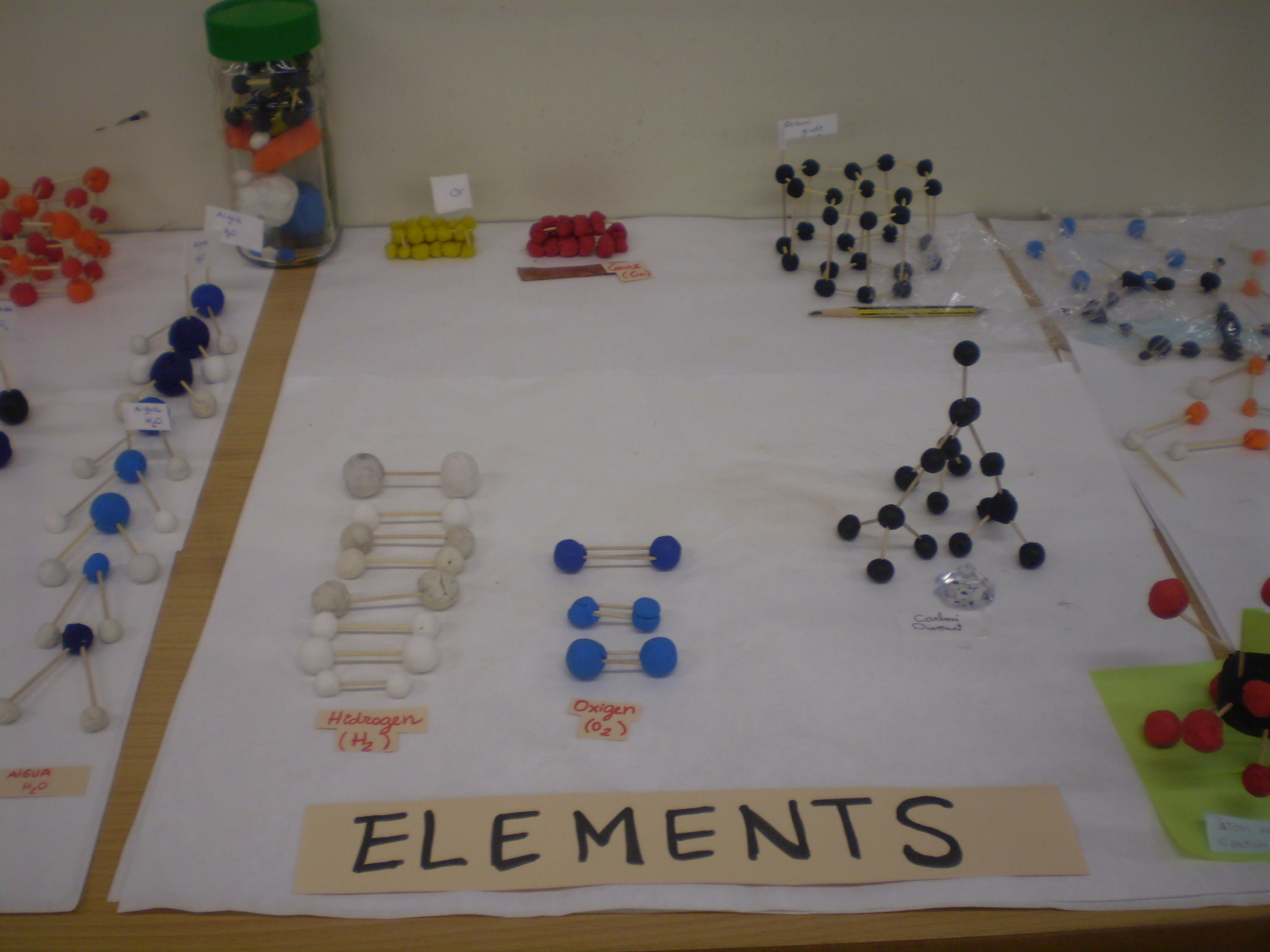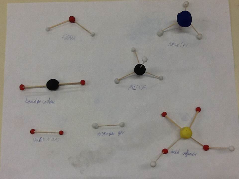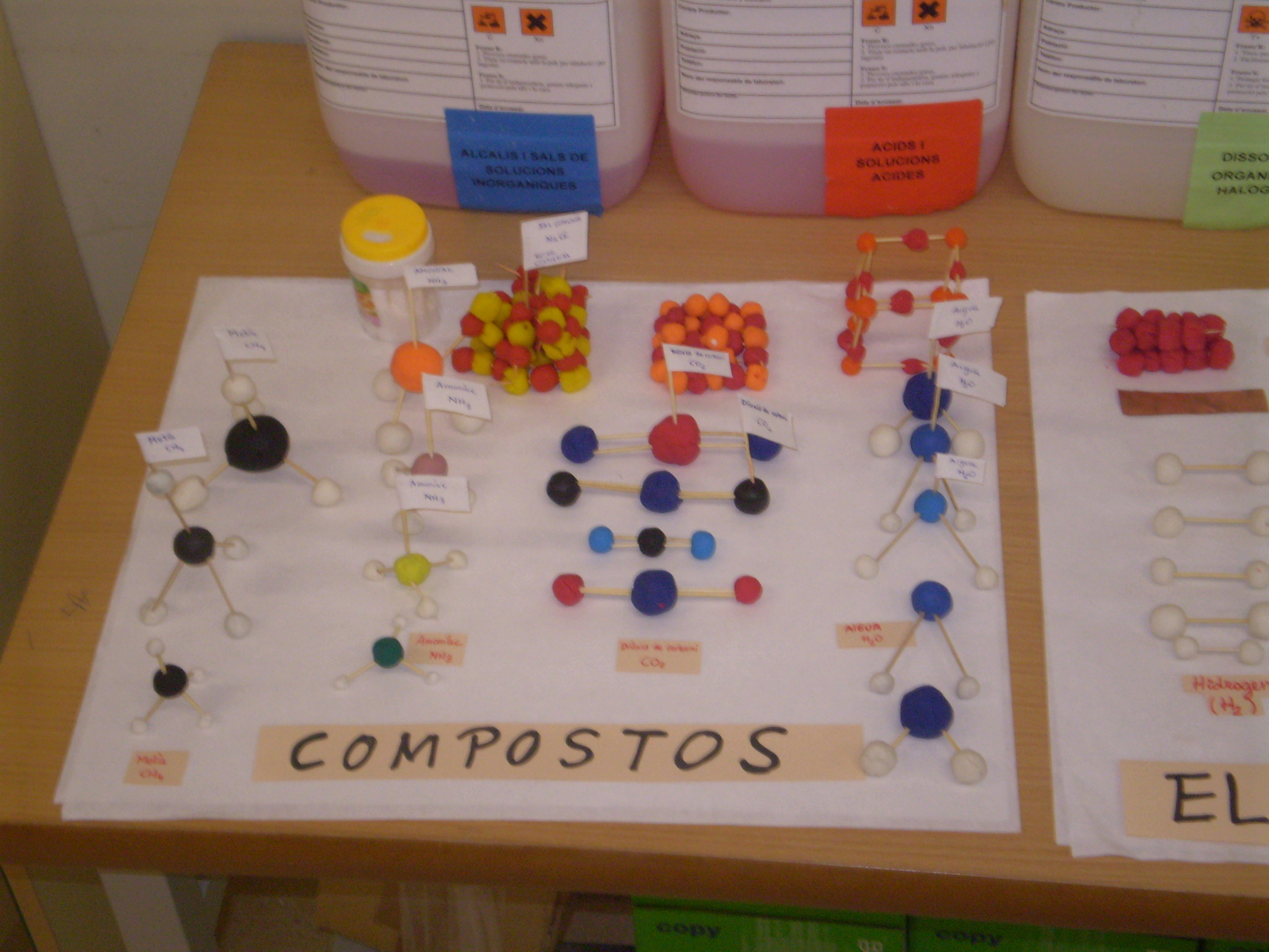 Observa les Imatges de molècules fetes amb plastilina per diversos alumnes. Recorda que un element químic és una substància pura formada per àtoms iguals i que un compost químic és una substància pura formada per molècules iguals.