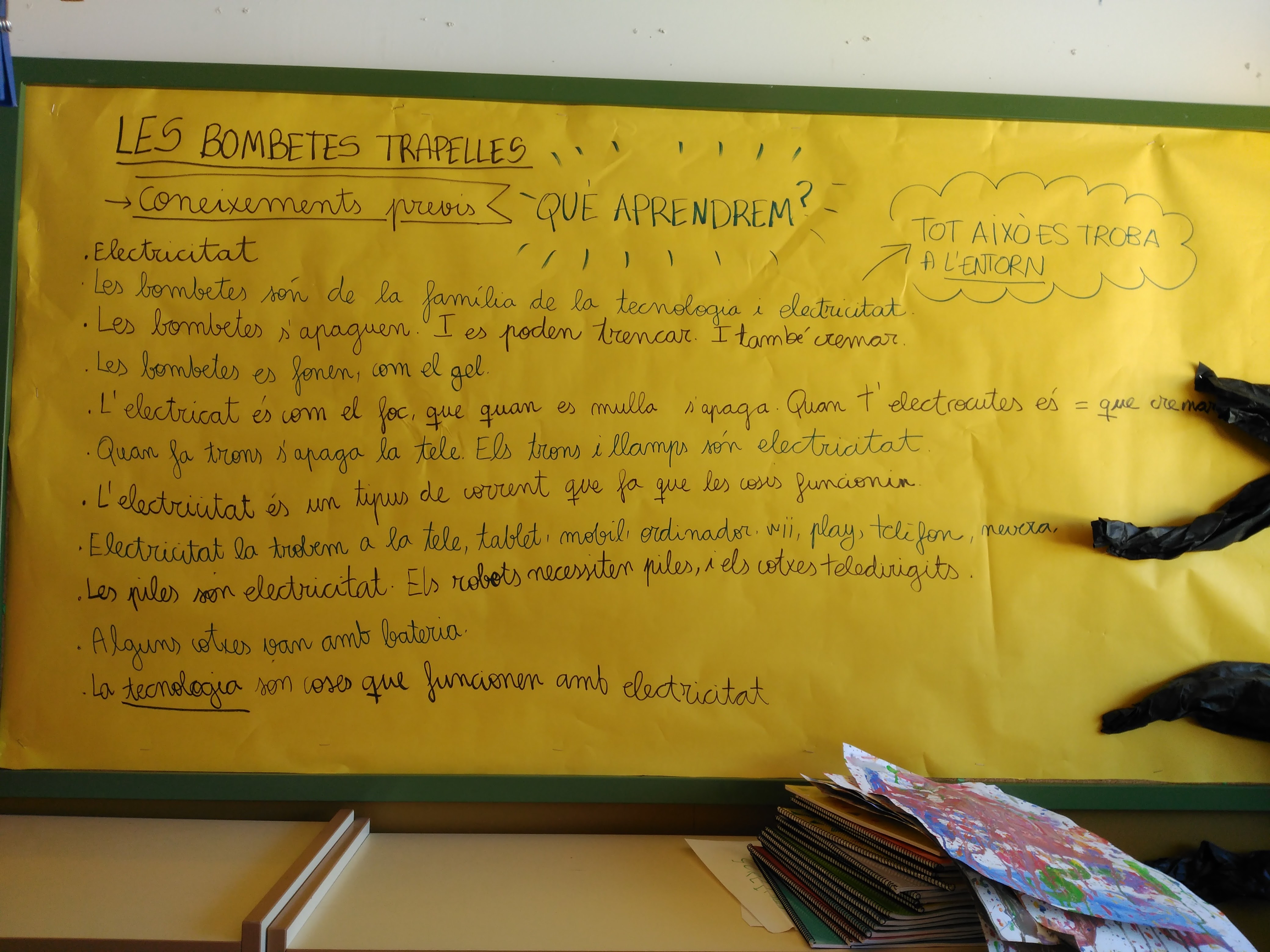 Ahir vam començar un nou tema de medi, hem acabat els éssers vius i hem començat amb l’Entorn, tecnologia i societat! Per començar vam explicar un conte anomenat “les bombetes trapelles” i després vam parlar una mica sobre què en sabíem sobre el tema, els nostres coneixements previs. Els vam apuntar tots a la classe. En sabem moltes coses, ara solament queda experimentar , aprendre, investigar i comprovar els coneixements previs (hipòtesis).