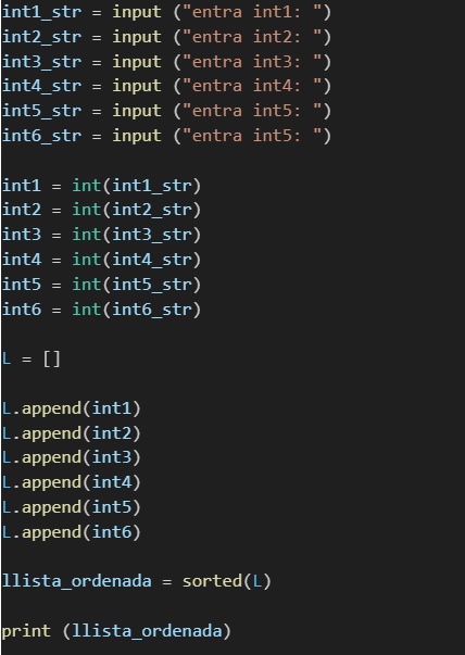 Després de veure algunes de les funcions bàsiques i d’aprendre a concatenar mitjançat la funció f-strings, hem realitzat algunes activitats amb Python com aquest codi que demana a l’usuari que entri 6 nombres, els emmagatzema en una llista “L” i els retorna ordenats.