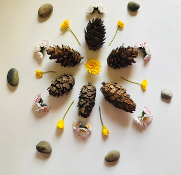 Després d’experimentar lliurement amb ells: fent-los rodar, apilant-los, classificant-los… entre tots hem fet un mandala amb els materials naturals.