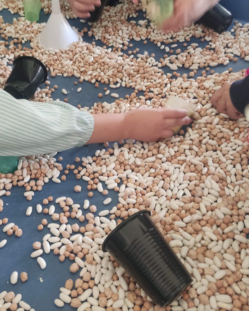 Aquesta setmana als minimons hem començat a fer transvasaments sòlids amb cigrons i mongetes i l’ajuda d’embuts i gots de plàstic.