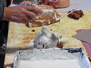Un cop sec el guix, treiem el fang amb cura i ja tenim un motllo de guix. Mullem el cartró amb cola líquida i emplenem amb trossets petits l´interior del motllo de guix. Esperem que quedi tot ben sec i…