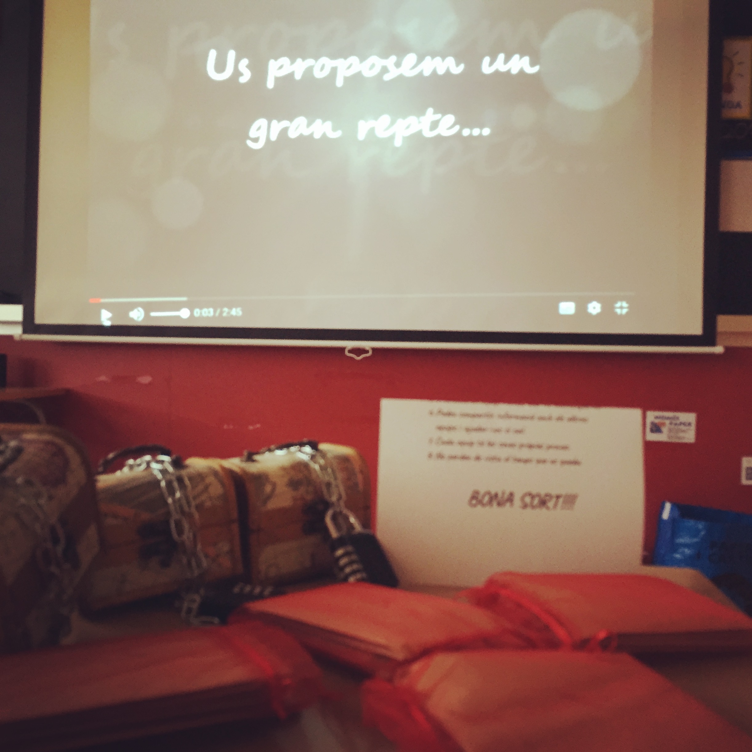 Aquesta tarda hem treballat d’una manera diferent. Hem separat les dues classes en 3 grups i la mestra ha tancat cada grup dins d’una classe. L’objectiu era trobar la clau que estava tancada dins d’un cofre per poder sortir de la classe abans de 45 minuts.