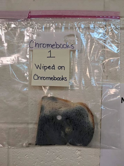 Us passo les fotos d’una escola que ho van fer.Van posar 5 llesques de pa en 5 bosses separades. Una llesca no va ser tocada en absolut, una altra va ser tocada per nens amb les mans sense rentar, una altra per nens que es van rentar amb aigua i sabó, la 4a va ser tocada per nens que van usar desinfectant de mans, i l’última la van fregar pels ordinadors de la classe.En algunes de les llesques es va començar a formar floridura en tan sols un parell de dies.Envians les teves fotos …..