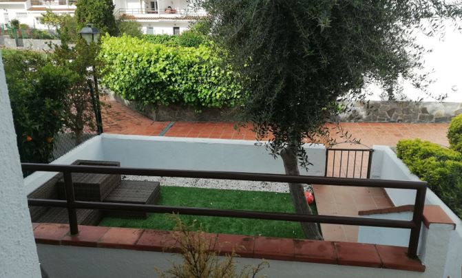 En la fotografía obtenemos la vista de las casas de mis vecinos de enfrente, blancas y todas iguales. Todas ellas tienen tres pisos y, por lo tanto, tapan la visión de lo que sea que escondan detrás. Más adelante, podemos apreciar lo descolorida y mal puesta que permanece la valla. A la derecha de la imagen está situada la puerta por la que salimos y entramos, porque yo no tengo portal, como la mayoría de gente. Delante de esta, varios árboles: un limonero, un olivero y un almendro oculto por la columna del porche. Distinguimos dicha columna porque es donde recae toda nuestra atención, gracias a la glicina color malva que la envuelve. Me encanta esta flor, a pesar de que en primavera siempre vienen muchos abejorros a polinizarla. En la parte inferior izquierda, divisamos un pequeño trozo del suelo de la terraza y, como justo hoy está lloviendo, me he sentado a escribir el texto aquí.