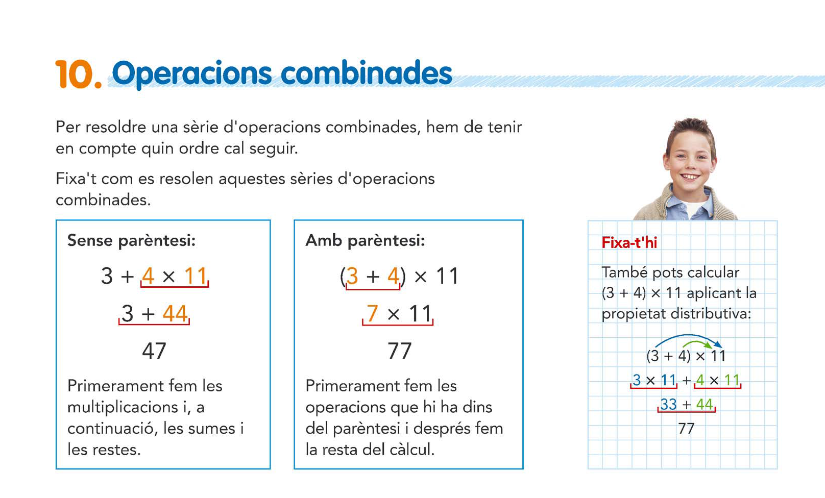 LA PROPIETAT DISTRIBUTIVA diu que per multiplicar un nombre per una suma o una resta, primer es multiplica el nombre per cada un dels termes de la suma o la resta i, després, se sumen o restes els factors o obtinguts.