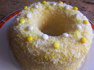Batre els ous amb el sucre fins aconseguir una crema homogènea i posa l’oli, el coco, el iogurt, la farina i el llevat. Untar el recipient amb la margarina i posa la massa. Posa-ho al forn uns 45 minuts. Si vols ho pots decorar.