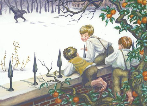 Van intentar jugar a la carretera, però era llena de pols, tota plena de pedres esmolades i no els gustava. Van agafar el costum de passejar-se, una vegada acavades les seves clases, al voltant de l’alt mur, per a parlar del bell jardí que hi havia a l’altre costat.