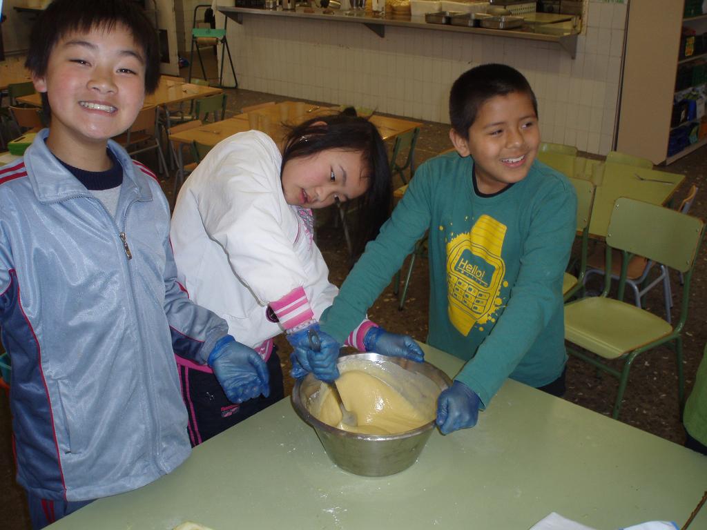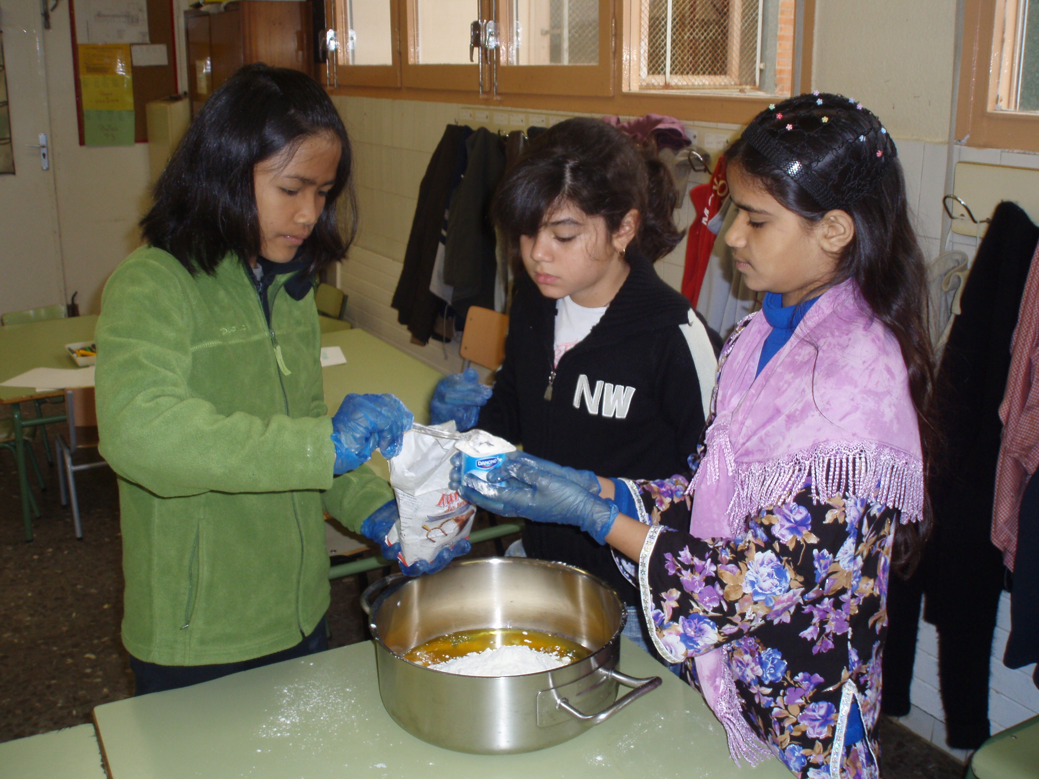 Amb l’ajuda de les cuineres, la Toñi, l’Antonia i la Paqui, que ens han deixat els estris i el forn, hem fet la base de la Mona: