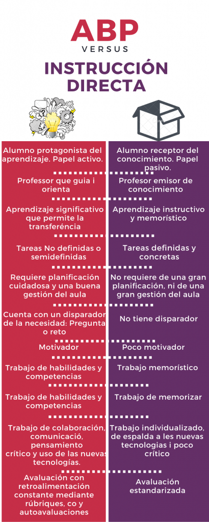 El papel del alumno: en la instrucción directa es un receptor de la información, lo cual genera desinterés y aburrimiento. Mientras que con el ABP el alumno es el protagonista de su propio aprendizaje. Un aprendizaje conseguido mediante la comunicación, reflexión, colaboración y el uso de las nuevas tecnologías. Un papel totalmente activo que consigue mantener un alto grado de motivación en el alumno.