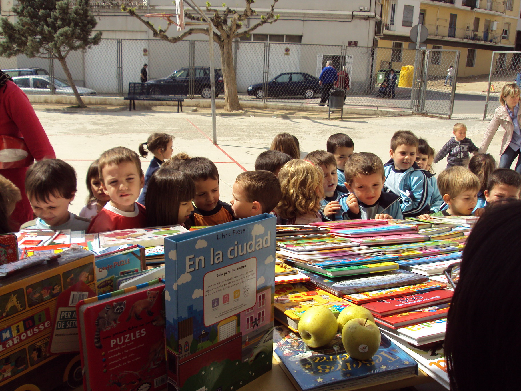 Alumnes de P3 visitant la parada de llibres del pati de l’escola.
