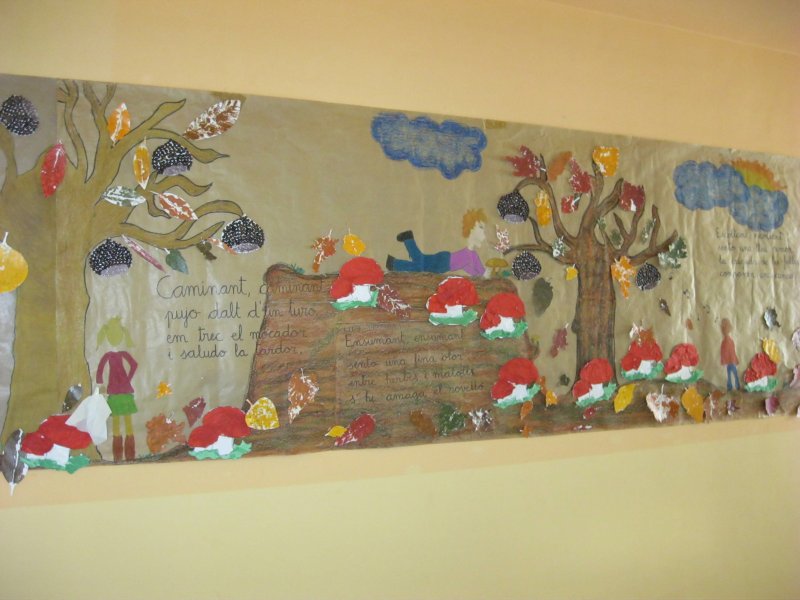 Hem treballat la tardor amb diferentes tècniques: / mural: ceres -/ fulles: pintura / bolets: paper de seda -/ castanyes: arròs i cafè