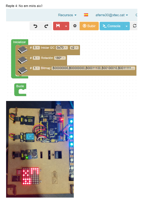 Hem treballat els diferents sensors i com poder-los visualitzar en pantalles. També cal destacar l’ús de la matriu Led. Aquí podeu veure alguns exemples!