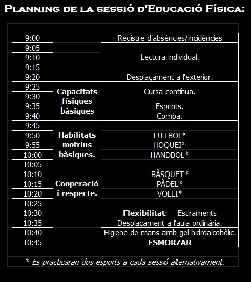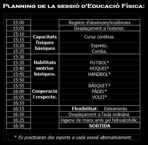 La distribució del temps per aquest curs de la sessió d’Educació Física serà de la següent manera :