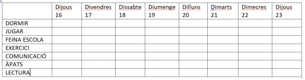 Al llarg d’una setmana, és a dir, des d’avui fins el dijous vinent, dia 23 d’abril, heu de prendre nota i fer un registre del temps que dediqueu a fer aquestes activitats: