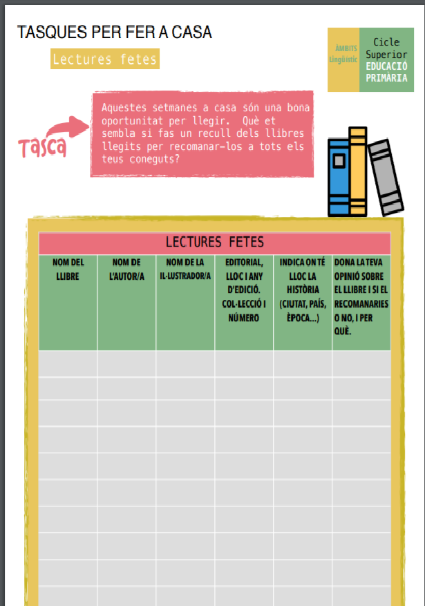 Un cop acabeu les lectures cal que porteu un registre, molt semblant al que fem a classe on haurem d’anotar algunes dades del llibre. També haureu de fer un petit resum d’unes cinc línies explicant a grans trets de què va el llibre. M’ho haureu d’enviar cada vegada que acabeu un llibre. Recordeu que penso que és bàsic i molt important dedicar estones de lectura cada dia.