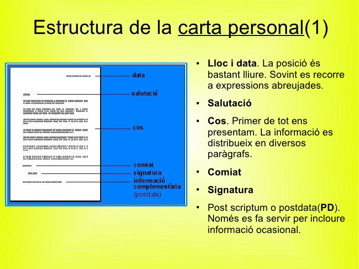 – Escriurem una carta de comiat al nostre fillol. Aquest escrit hauria de tenir el format d’una carta, és a dir, amb el lloc i la data encapçalant l’escrit, una salutació, el cos o contingut de la carta, el comiat i la nostra signatura. En aquest exemple podeu veure la distribució al full.