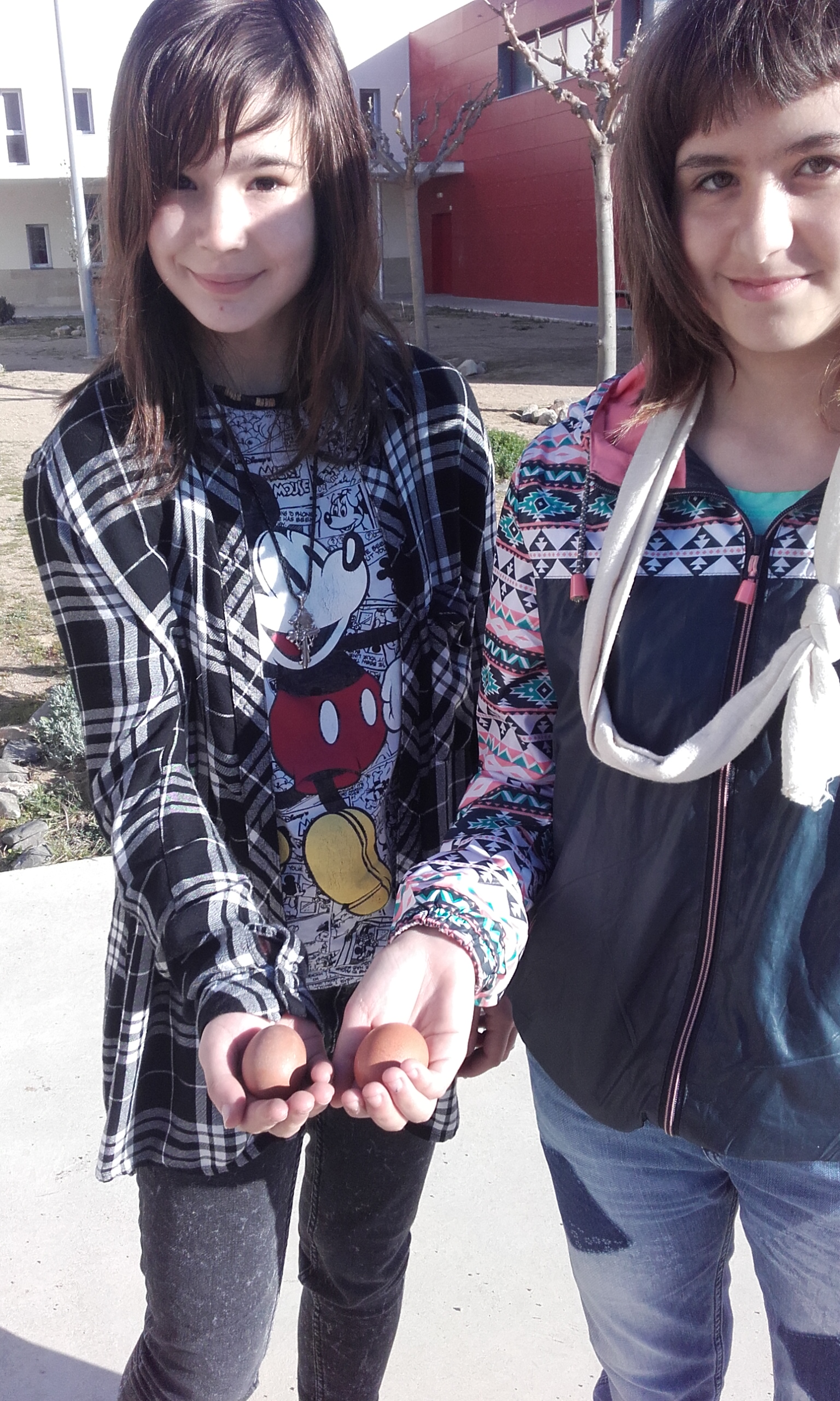 Cada dia un alumne diferent se’ls emporta cap a casa: hem començat pels alumnes de l’Aula Oberta de 3r d’ESO, ja que són ells els que van construir el galliner: el Manel, el Sergio i la Noèlia ja han provat els ous de les gallines de l’institut: la “Rubia” i la “Morena”.