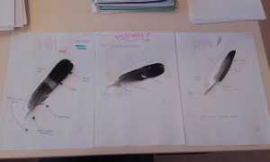Estudiem les plomes: per a què serveixen? Les observem al microscopi i així aprofitem per treballar les parts del microscopi i aprenem com mirar pel microscopi.