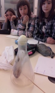 Hem posat els ous en vinagre. En un vas hi hem afegit puntura rosa, en un altre hi hem afegit pintura verda i en el tercer vas hi hem afegit pintura blava. Els hem deixat durant una setmana a fora de la finestra. Hem aprofitat per treballar el nom del material del laboratori.