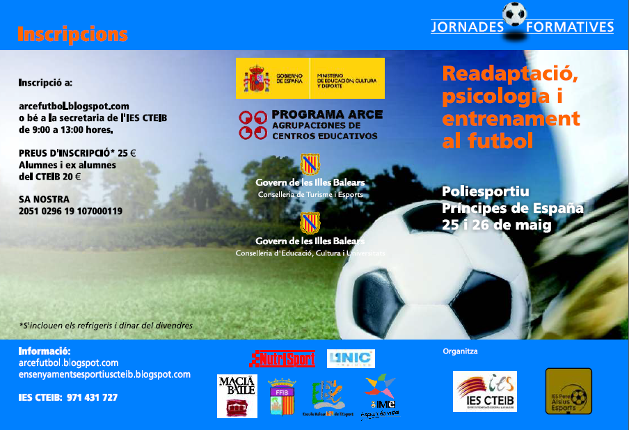 Sota el nom “Readaptació, psicologia, i entrenament al futbol”, el Centre de Tecnificació Esportiva de les Illes Balears organitza els propers 25 i 26 de maig unes Jornades Formatives orientades als professionals i estudiants vinculats al món del futbol. Emmarcades dins del projecte ARCE, les jornades s’estructuren en tres grans blocs: la readaptació, la psicologia, i l’entrenament, comptant amb la presència de ponents de gran nivell com l’entrenador i exjugador blaugrana Jose Mari Bakero, o el preparador físic del RCD Mallorca Josep Alomar.