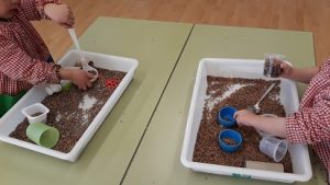 Aquest trimestre hem començat a fer tallers d’experimentació amb farina, arros i llenties. Tot manipulant i explorant aquests materials aprenem alguns conceptes matemàtics i científics.