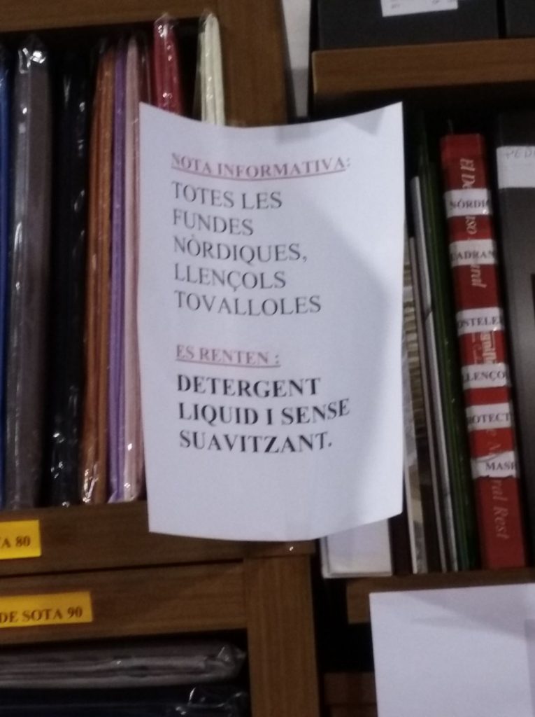 L’altre dia vaig anar a comprar a una botiga de mobles i de complements per la casa. Quan estava a punt d’entrar vaig veure aquest cartell enganxat al vidre de l’aparador. Hi ha la paraula “liquid” sense accent; la paraula correcta és “líquid”.