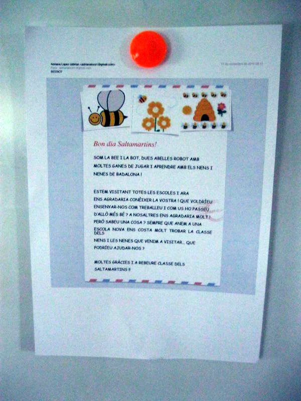 AQUEST MATÍ HEM TINGUT UNA GRAN SORPRESA: LA MONTSE HA REBUT UN MISSATGE PELS SALTAMARTINS DE LA BEE I LA BOT, DUES ABELLES ROBOT VOLEN VENIR A LA NOSTRA CLASSE.
