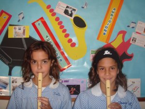 There are 29 desks for the pupilsand a big table for the teacher.Our music teacher is Nuria.She teachs us to play different instruments and we sing songs too.Sometimes Nuria writes some scores in the blackboard and we have to guess which one it is.