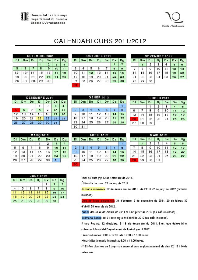 També fem públic per al vostre interès el calendari que l’escola ens va facilitar a tots nosaltres corresponent al curs 2011-2012