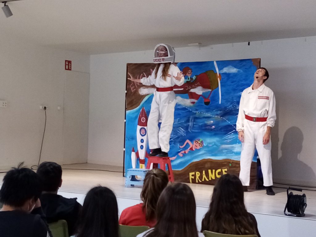 Aquesta setmana els nens i nenes de Cicle Superior hem gaudit de l’obra de teatre «COME FLY WITH ME», un espectacle dedicat a la vida de tres dones extraordinàries que van fer història: la cosmonauta Valentina Tereshkova (primera dona que va anar a l’espai), l’atleta Trudy Ederle (primera dona a travessar nedant el Canal de la Mànega) i l’aviadora Amy Johnson (primera dona a fer un vol en solitari, des d’Anglaterra fins a Austràlia). L’obra va estar representada per una actriu i un actor britànics, i va captivar l’atenció de tots els espectadors.