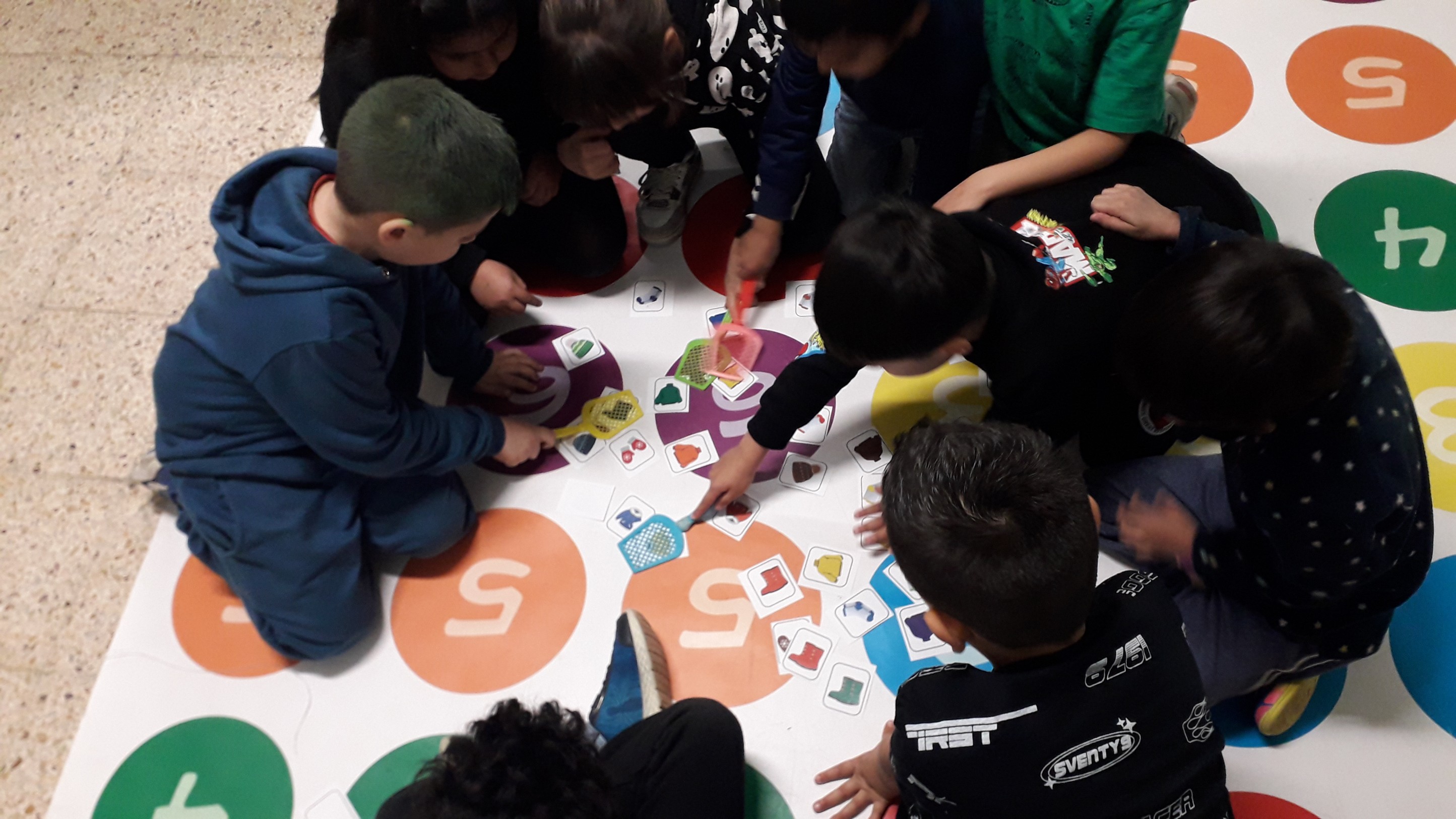 Today, 5-years-old students played the “splash the clothe” in the carpet. In pairs or threes, children listen to a clothe and need to look for the clothe and the correct colour. The first team who splash with the swatter, will score a point. Here you can see some videos and pictures.