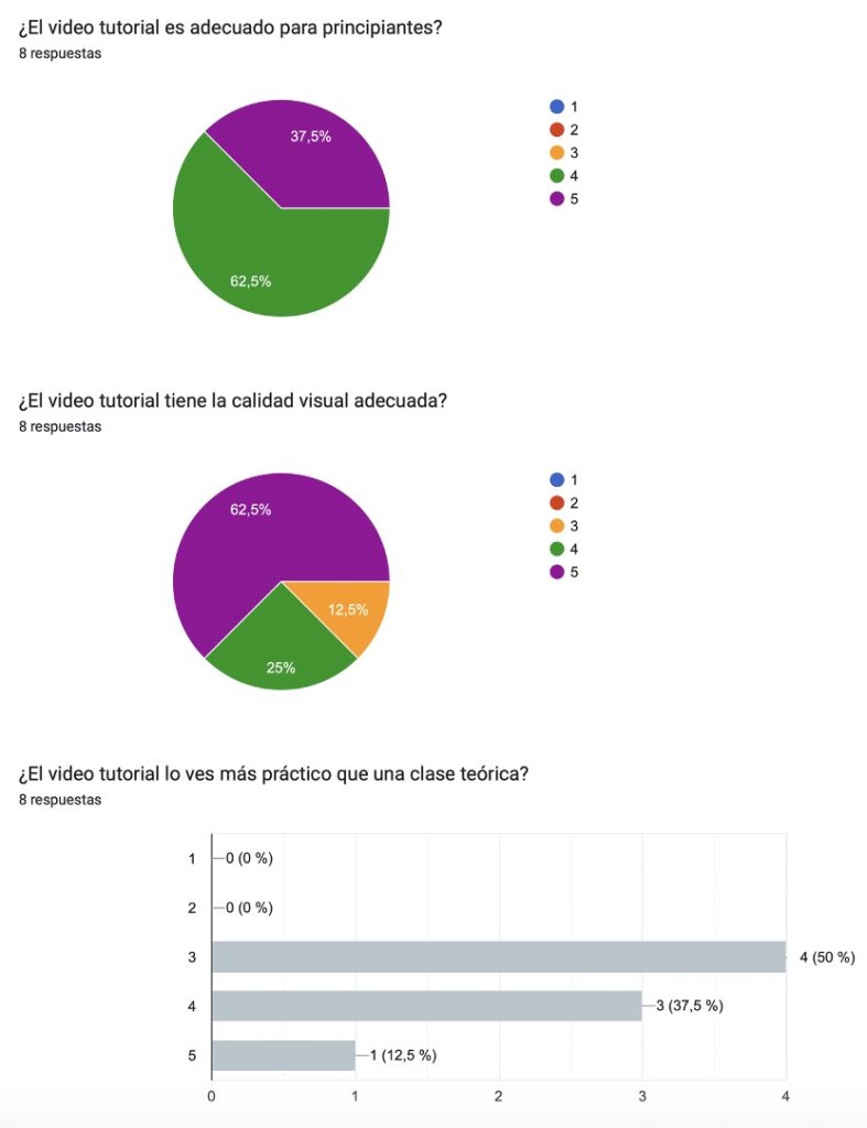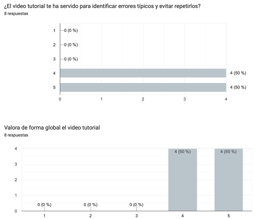 Evidencia 2 (E2). Encuesta de satisfacción anónima y en línea realizada al alumnado de la materia de programación de primero de bachillerato tras la visualización del video tutorial. Esta evidencia demuestra una tipología escrita, ya que se exponen las respuestas de los alumnos.