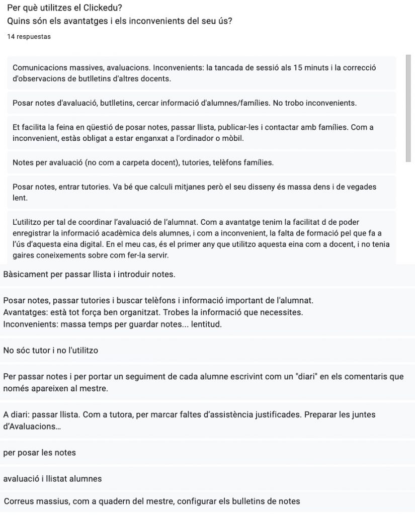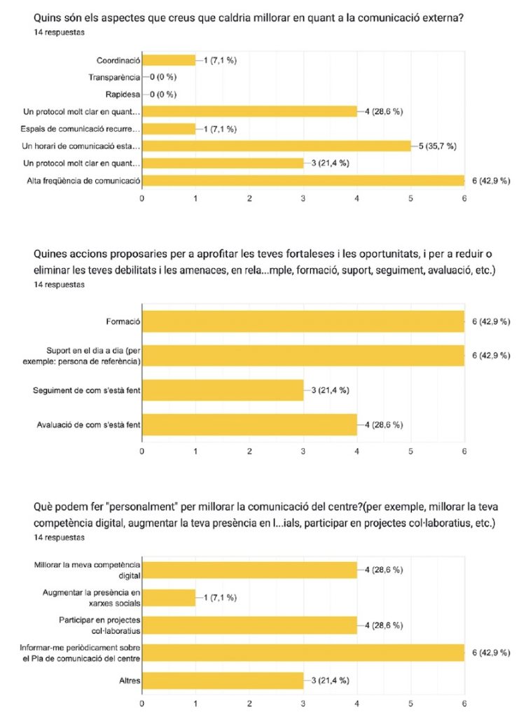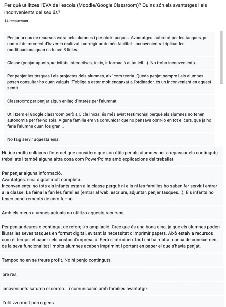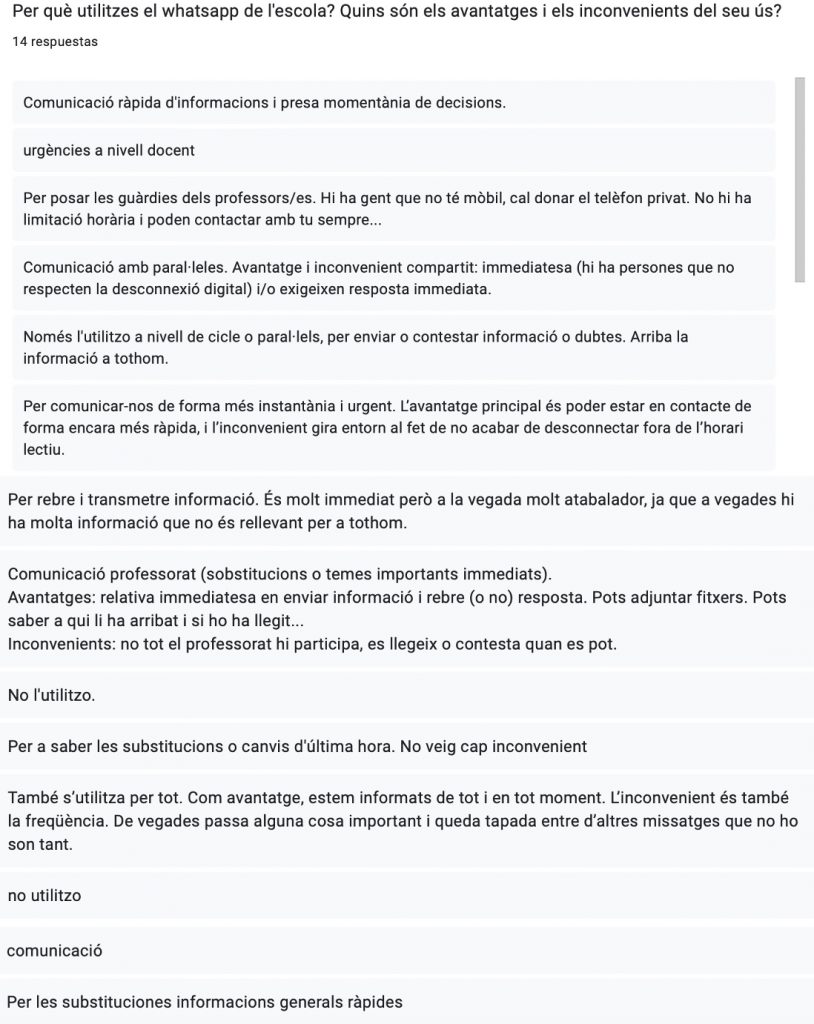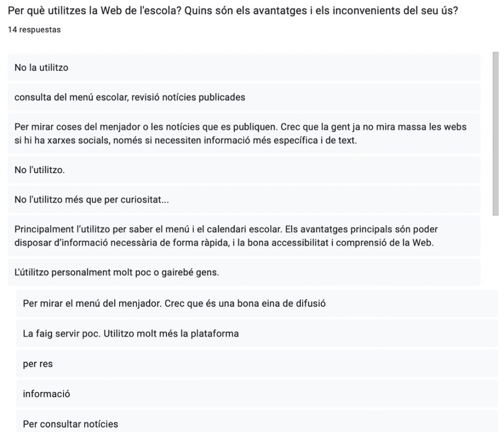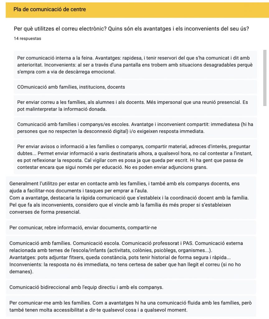 Evidencia 1 (E1). Entrevistas por google form a equipo directivo y personal docente clave para recoger la información para elaborar un análisis DAFO para tener herramientas a la hora de redactar el Plan de Comunicación de centro. Esta evidencia demuestra una tipología escrita, ya que se exponen las respuestas del equipo directivo y personal docente clave.