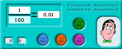 Si cliqueu a sobre del joc, la imatge s’ampliarà. Els botons de color blau, taronja i lila serveixen per canviar les xifres del numerador i del denominador i el de color verd per saber si la vostra resposta és correcta o no. Si està bé el senyor fa una cara contenta i si no, fa cara d’espantat.