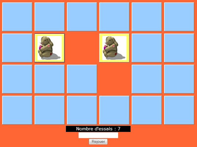 En aquest joc heu de trobar les parelles d’imatges, clicant a sobre dels quadradets. Per començar a jugar, heu de clicar a sobre del joc i llavors s’obrirà en una nova finestra. Amb aquesta activitat, treballareu l’atenció i la memòria. Després de jugar-hi, podeu fer comentaris explicant si us ha agradat i quants intents (nombre d’essais) heu necessitat per formar totes les parelles. Si voleu tornar a jugar haureu de clicar on diu “rejouer”.