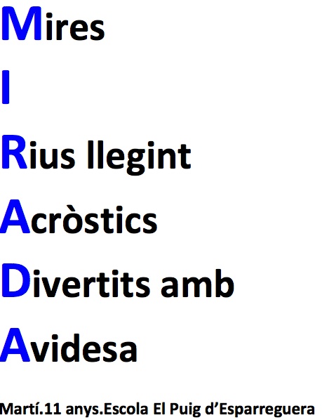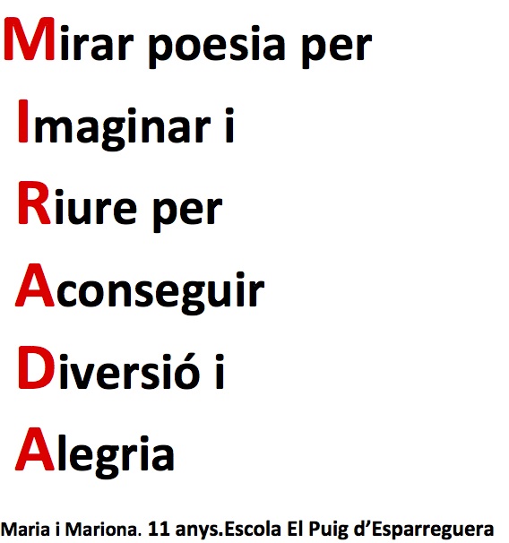 També informar-vos que aquest cap de setmana al programa “Maneres de viure” de La Xarxa, la Carme Parras, mare del Guillem Arnal de la classe de la Lluna, ha enregistrat poemes recitats per nens i nenes de la nostra Escola que aniran apareixent al llarg del programa tant el dissabte com el diumenge. És al 90.1 o bé des d’internet on pengen tot el programa: http://www.laxarxa.com/