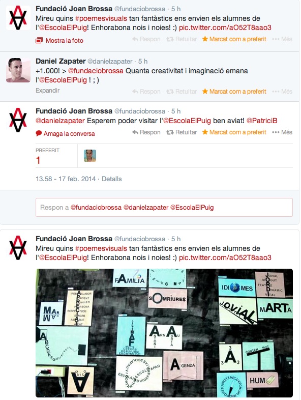 A través de Twitter la Fundació Joan Brossa ens ha fet saber que ha vist els poemes visuals que tenim exposats a la saleta del pis de la Classe…Mireu què ens han comentat…Moltes gràcies…
