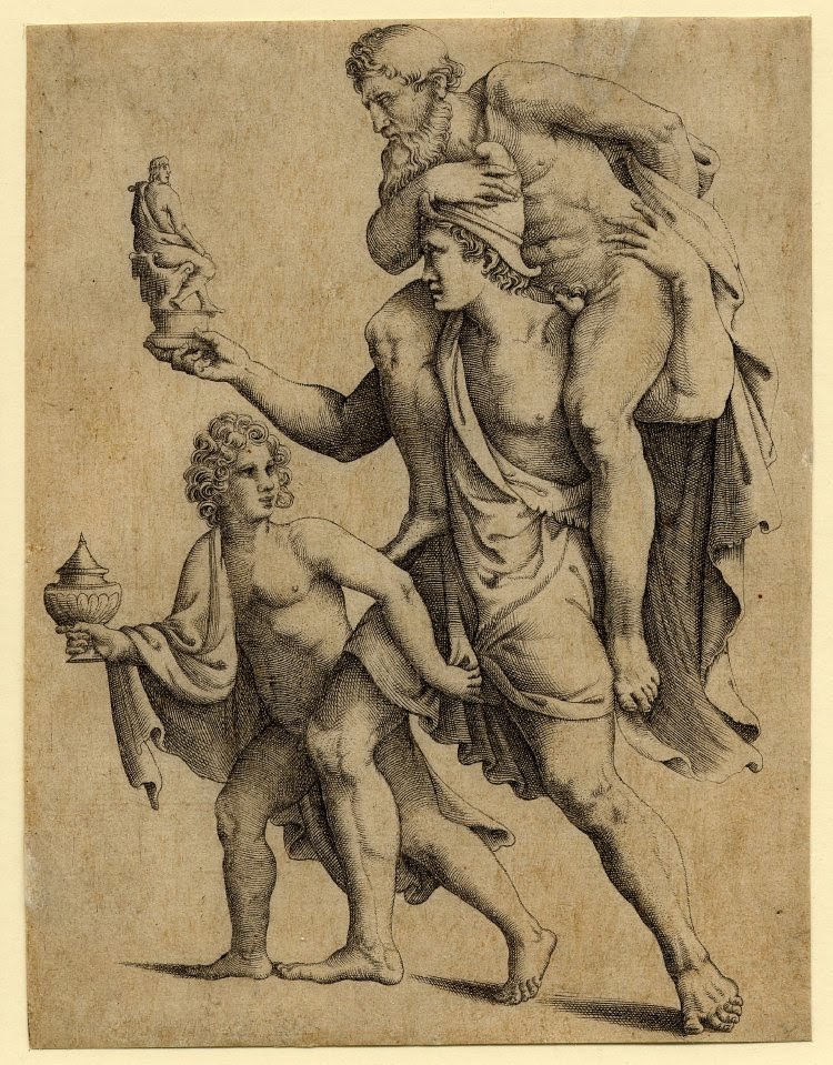 He escollit de l’Eneida de Virgili i d’ Ab Urbe Condita de Tit Livi, l’episodi en el qual el troià Eneas, fill d’Anquises i de Venus, fuig de Troia, un cop destruïda i saquejada, portant el seu pare a les espatlles i el seu fill Ascani.