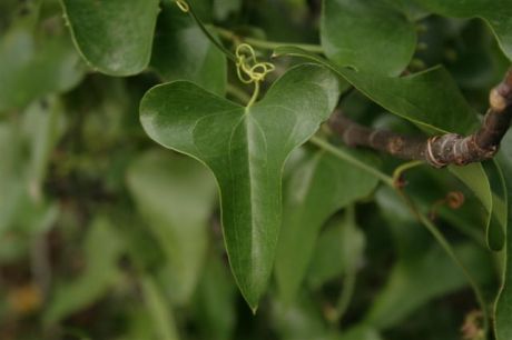 DESCRIPCIÓ: Arítjol, heura del diable, matavelles; en castellà zarzaparrilla.Liana de fulles lluents amb la base en forma de cor i espines molt petites al marge de la fulla. A la base de la fulla circells foliars. La baia pot ser negra o roja.
