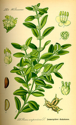 Arbustiu, boix en català, en castellà boj. De fulla perenne pot arribar als 2 metres d’alt. Fulles elíptiques verdes de l’anvers i groguenques al revers. No canvien de color i sempre es mantenen verdes. Són lluentes, sense pilositats, oposades i enteres. El peciol és curt. Es cargolen als marges. El fruit es rodó, coriaci, de la mida d’un péssol amb tres banyes i de color verd.