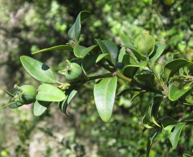 Arbustiu, boix en català, en castellà boj. De fulla perenne pot arribar als 2 metres d’alt. Fulles elíptiques verdes de l’anvers i groguenques al revers. No canvien de color i sempre es mantenen verdes. Són lluentes, sense pilositats, oposades i enteres. El peciol és curt. Es cargolen als marges. El fruit es rodó, coriaci, de la mida d’un péssol amb tres banyes i de color verd.