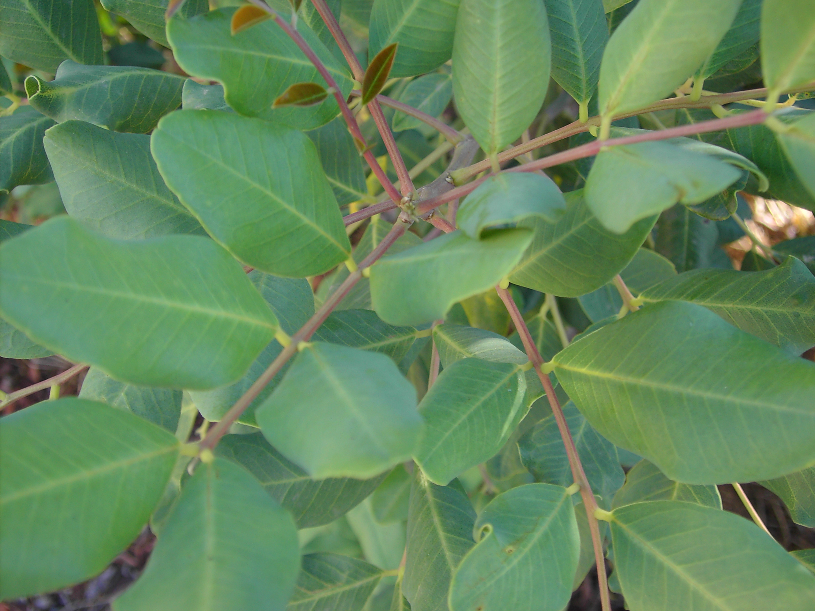 És un arbre de fulla perenne, bipinnada (paripinnades), coriàcies (dures) i compostes, amb 3, 4, 5 parells de foliols elíptics o ovats, enters, d’un color verd fosc a l’envers i més clar al revers. Les flors són apètales, menudes i roges. El calze està constituït per cinc sèpals caducs; cinc estams lliures; pistil amb estigma molt visible.
