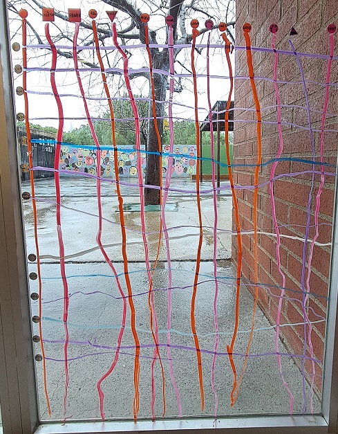 Després de treballar el traç vertical a la finestra de la nostra classe….hem passat a fer traços horitzontals (d’un costat a l’altre). Ens ha quedat una quadrícula maquíssima!!